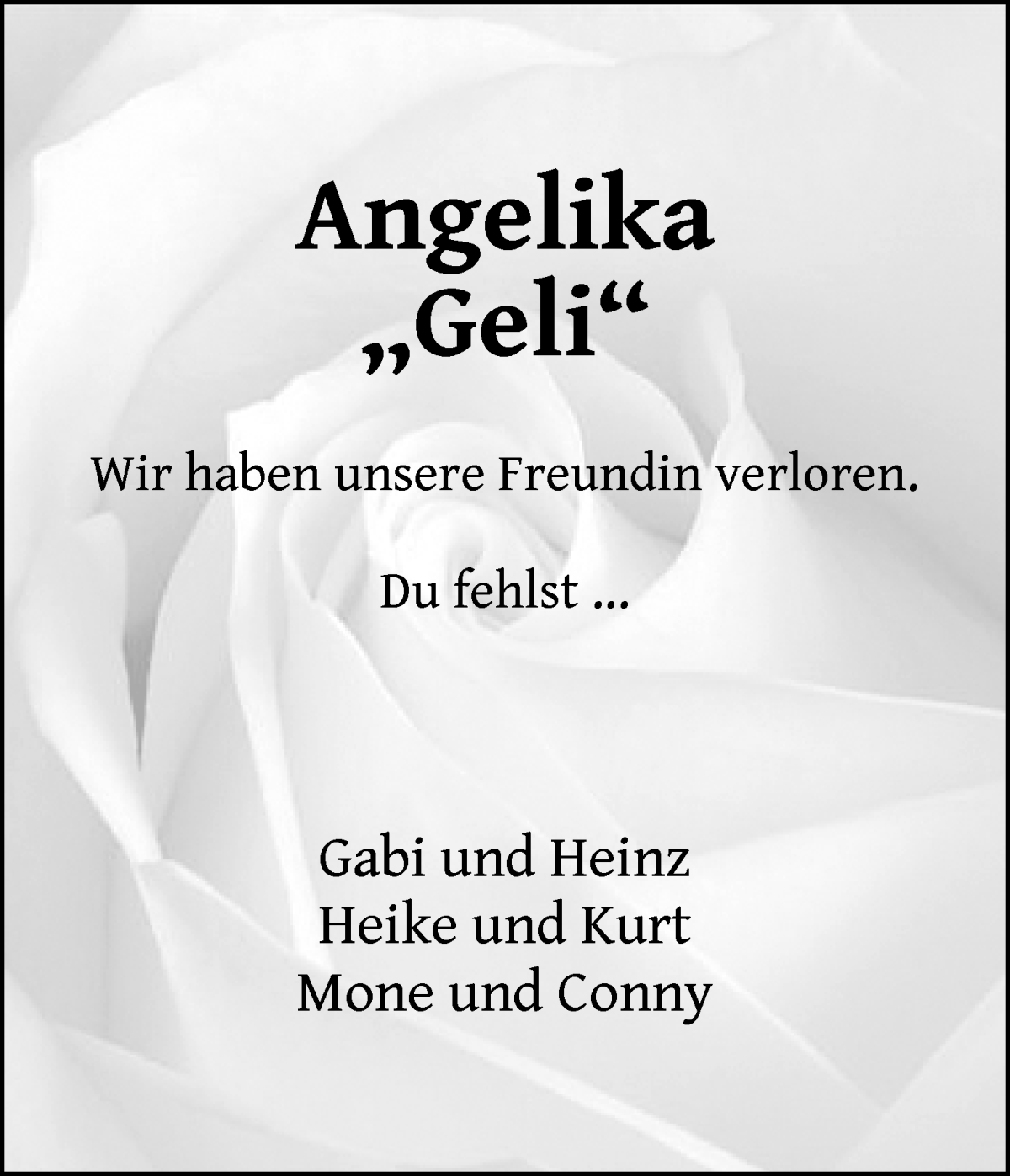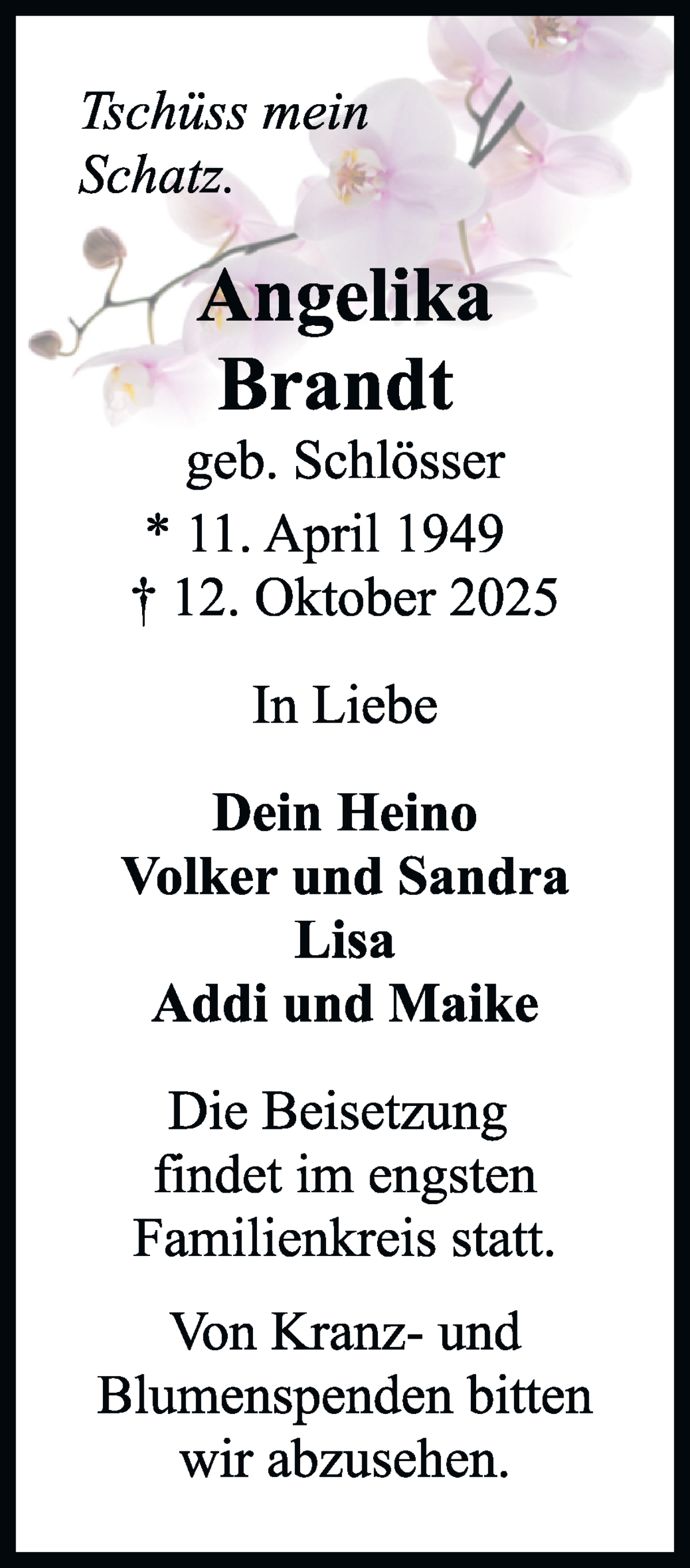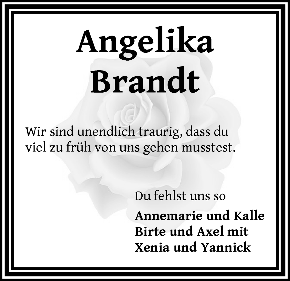 Hier finden Sie alle Traueranzeigen aus der Zeitung, die bisher für Angelika Brandt erschienen sind. Weitere Traueranzeigen, die in der Zeitung erscheinen, werden hier ebenfalls aufgelistet