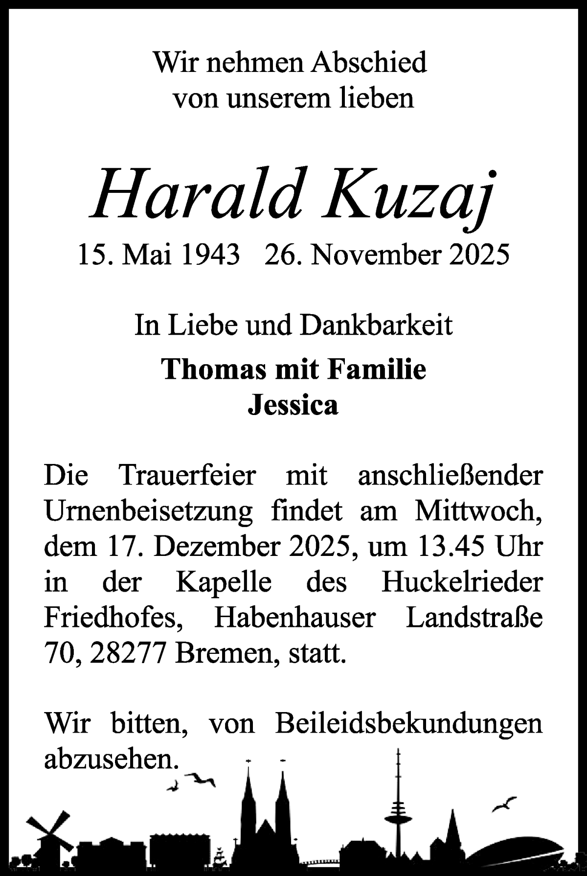 Hier finden Sie alle Traueranzeigen aus der Zeitung, die bisher für Harald Kuzaj erschienen sind. Weitere Traueranzeigen, die in der Zeitung erscheinen, werden hier ebenfalls aufgelistet