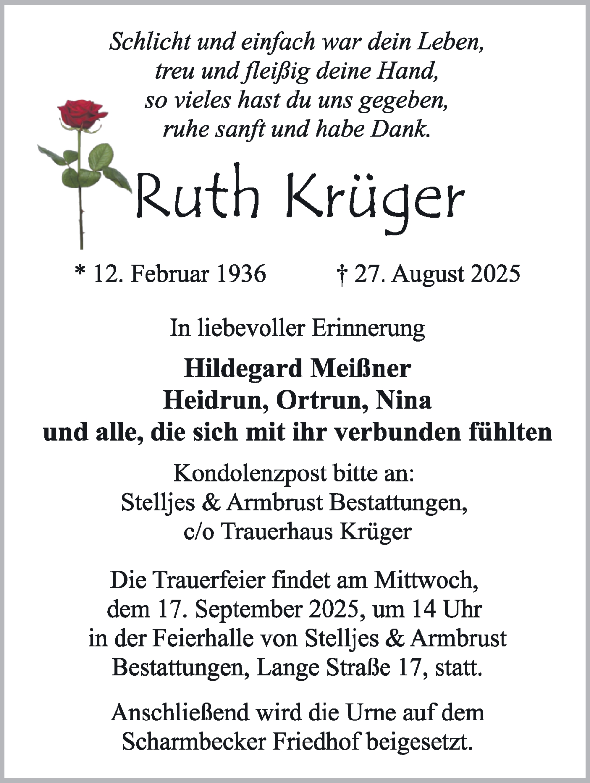 Hier finden Sie alle Traueranzeigen aus der Zeitung, die bisher für Ruth Krüger erschienen sind. Weitere Traueranzeigen, die in der Zeitung erscheinen, werden hier ebenfalls aufgelistet